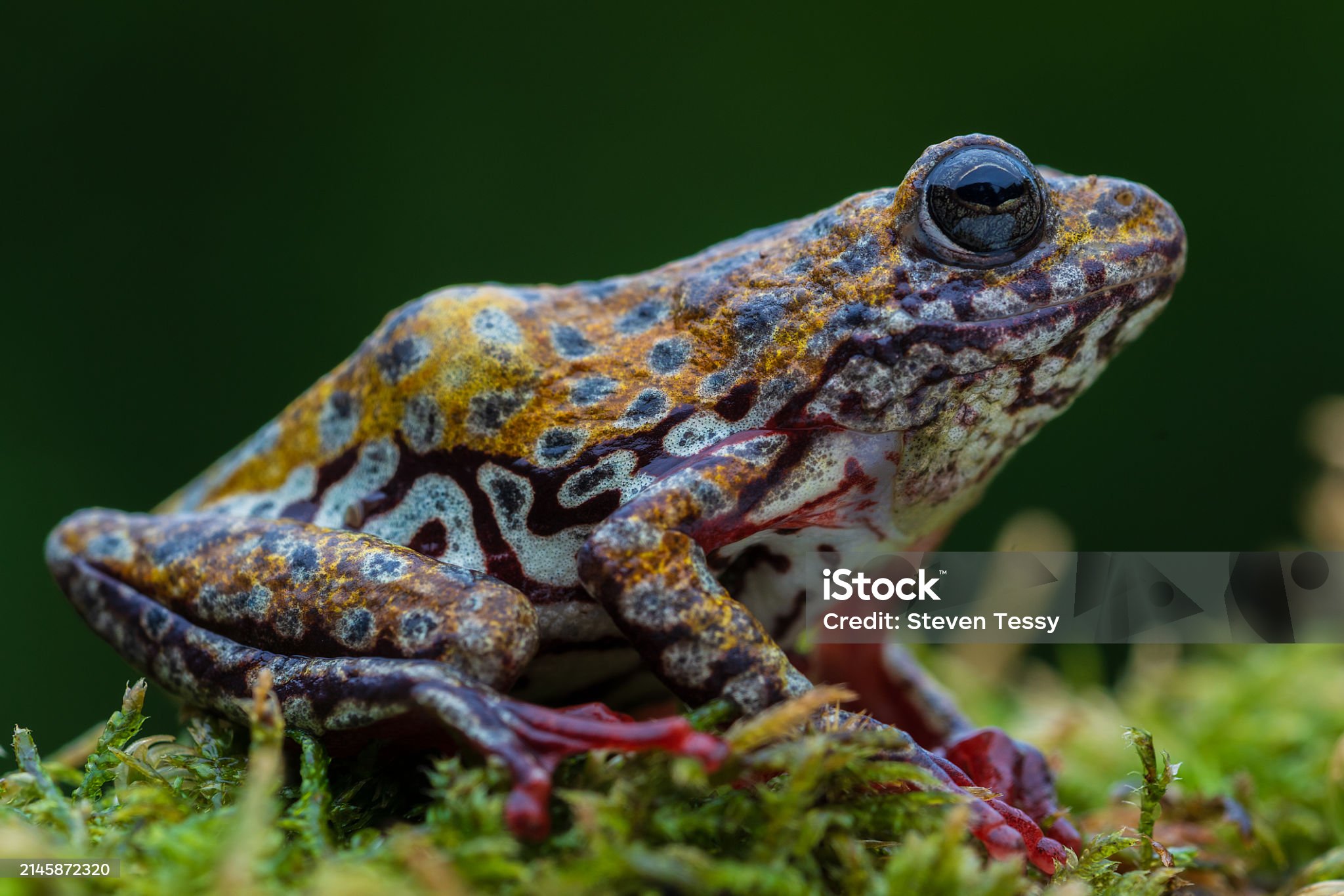 A bright, colorful frog that looks almost like a toy. It lives in rocky, high-altitude forests.